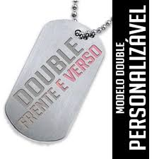 A dog tag frente e verso é uma única placa de aço inox, gravada dos dois lados, permitindo diferentes combinações de personalização: