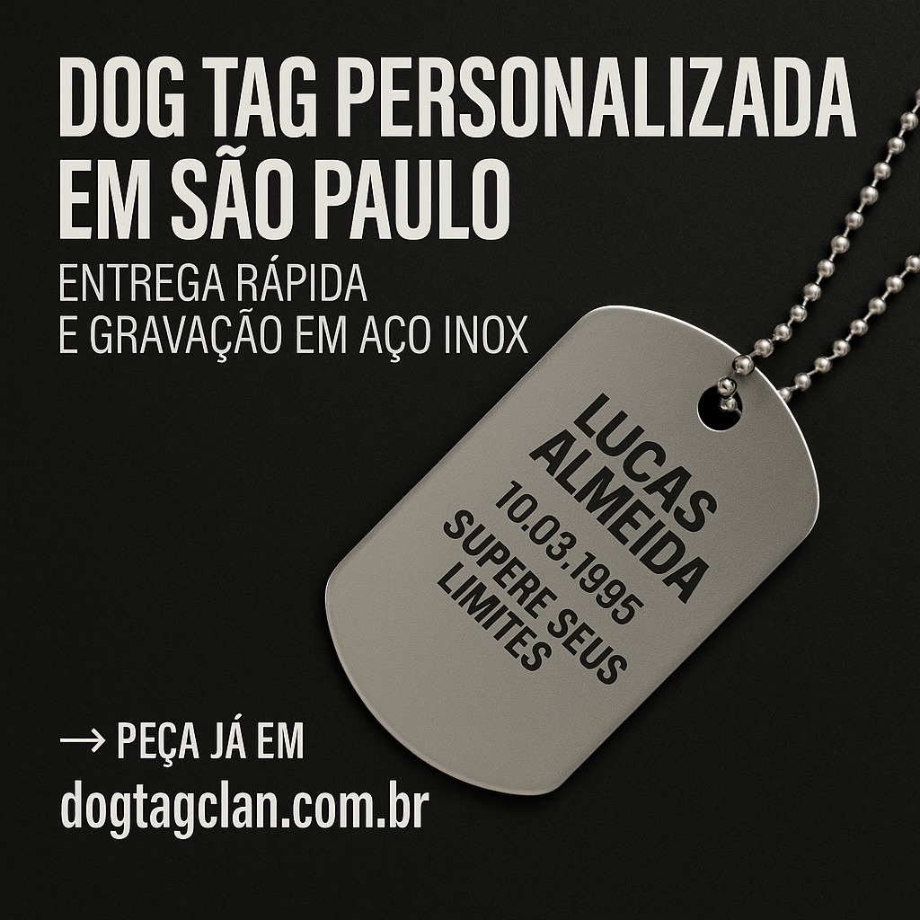 É nesse cenário de movimento, propósito e estilo que nasce a dog tag personalizada em aço inox da DogTagClan, uma peça feita para quem quer carregar sua história no peito, de forma autêntica e duradoura.