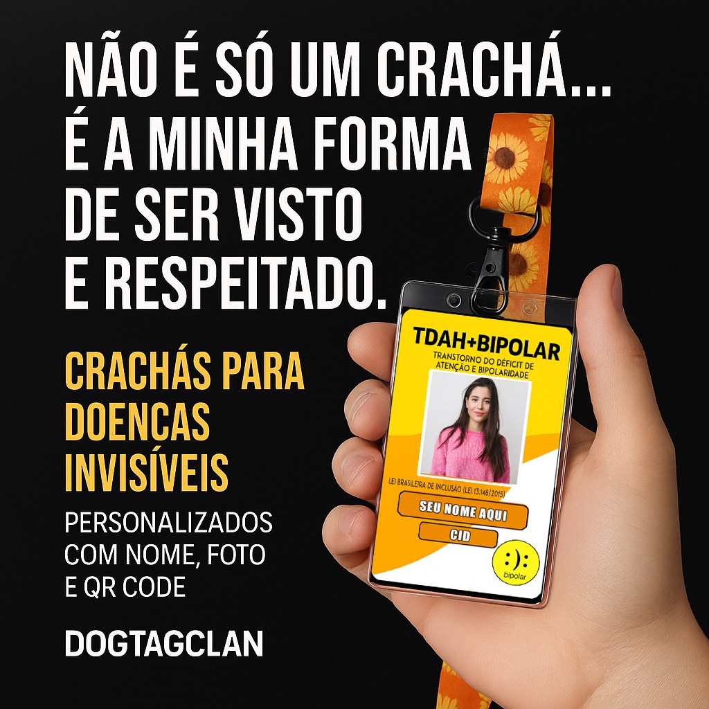 É por isso que os Crachás de Identificação para Doenças Invisíveis da DogTagClan foram criados: para dar voz, visibilidade e dignidade a quem convive diariamente com transtornos e condições pouco compreendidas, como o TDAH, o Transtorno Bipolar e as Doenças Raras.