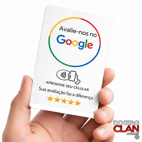 O cartão de avaliação Google NFC é um cartão físico (PVC padrão bancário 0,76mm) que permite ao cliente acessar diretamente a página de avaliação da sua empresa no Google com apenas um toque no celular.
