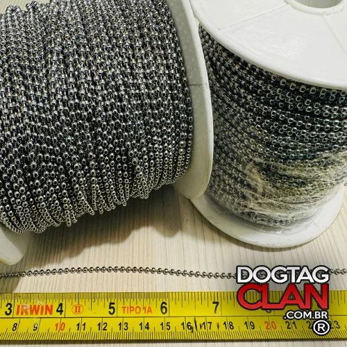 A corrente de bolinha (também chamada de ball chain) é formada por pequenas esferas metálicas interligadas, normalmente usadas com fecho tipo canoa ou conectores específicos.