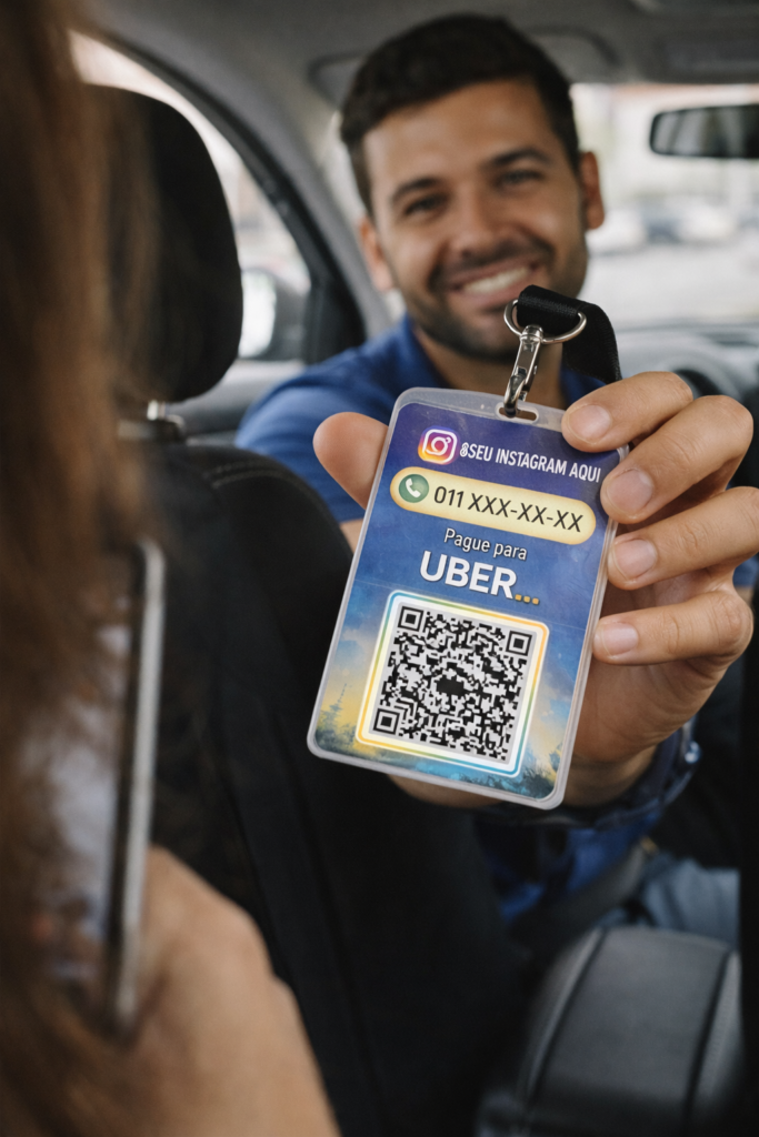 O crachá com QR Code para Uber surgiu exatamente para isso — facilitar pagamentos via Pix, reforçar a identificação profissional e transmitir mais segurança ao passageiro.