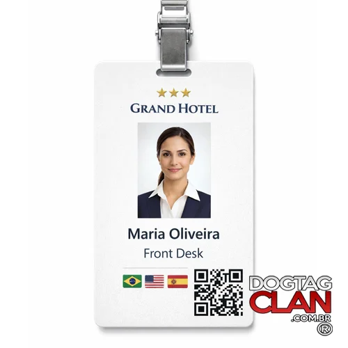 Se você procura crachá personalizado para empresa, com qualidade profissional e opção de QR Code ou NFC/RFID, a DogTagClan produz modelos sob medida para identificação corporativa e controle de acesso.