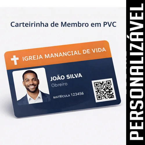 Hoje, muitas igrejas buscam modelos em PVC rígido padrão cartão bancário (0,76mm), com impressão profissional, maior durabilidade e acabamento moderno.