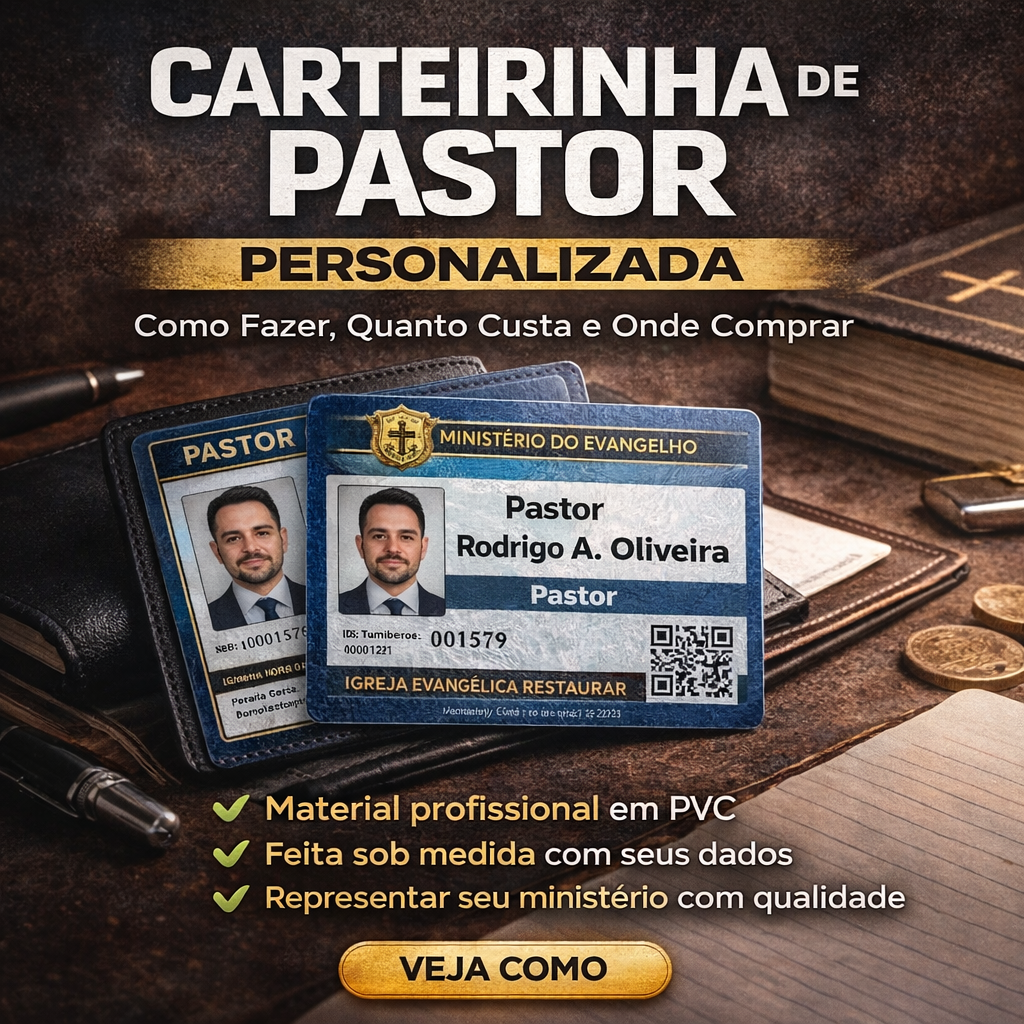 A carteirinha de pastor personalizada é um item essencial para identificação em hospitais, visitas ministeriais, eventos e até no dia a dia da igreja.