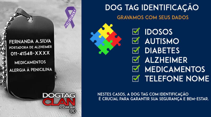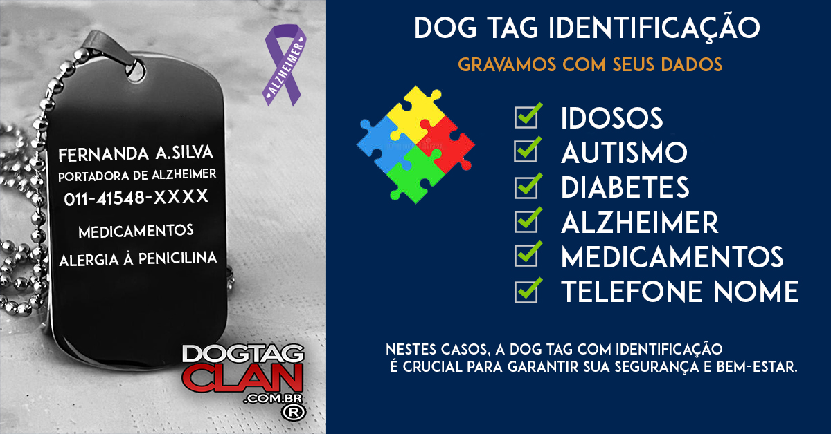 Dog tag Identificação – Idosos Autismo Diabetes Alzheimer