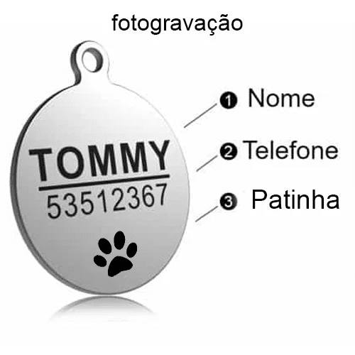 A gravação em aço inox garante leitura rápida por quem encontrar seu pet.