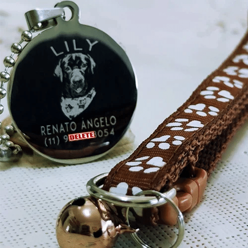 A gravação em aço inox garante leitura rápida por quem encontrar seu pet.