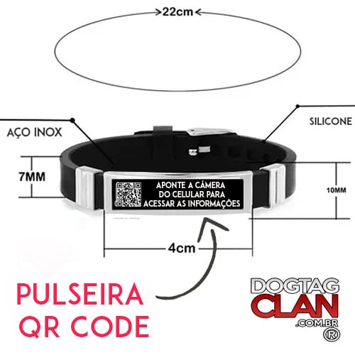 Você encontra esse modelo de pulseira com QR Code personalizada diretamente na DogTagClan.