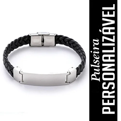 Nossa pulseira personalizada é feita em aço inox escovado com couro trançado, oferecendo resistência e estilo.