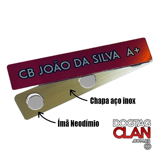 A tarjeta militar com imã é uma placa de identificação feita geralmente em aço inox, utilizada em uniformes, com sistema de fixação magnética (ímã), evitando furos no tecido.