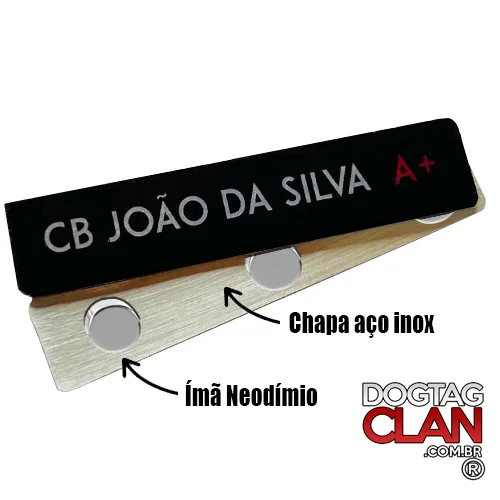 A tarjeta militar com imã é uma placa de identificação feita geralmente em aço inox, utilizada em uniformes, com sistema de fixação magnética (ímã), evitando furos no tecido.